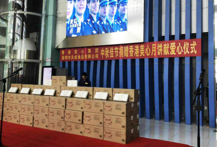 香港美心集团和深圳乐鱼(中国)今年共捐出5011盒美心奶黄月饼,单价为255元,市场总价1277805元。分别为深圳市慈善会2000盒,深圳报团工会2311盒,盐田区民政局700盒。